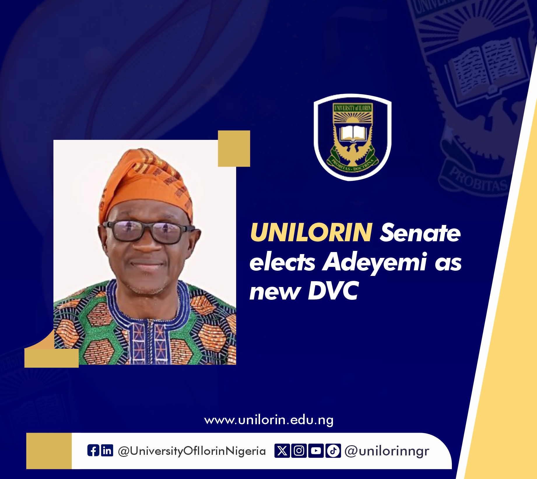 Senate elects Adeyemi Deputy Vice Chancellor By Tajudeen Babamale and Isaac Lewu The Senate of the University of Ilorin has elected Prof. Olalere Adeyemi of the Department of Linguistics and