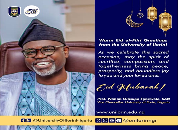 The Vice Chancellor of the University of Ilorin, Prof. Wahab Olasupo Egbewole, SAN, has congratulated members of the institution’s Muslim community and the entire Muslim Ummah on this year’s Eid
